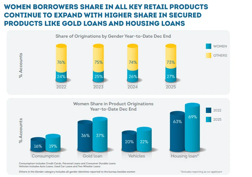 महिला उधारकर्त्ताओं के पास ₹76 लाख करोड़ का क्रेडिट पोर्टफोलियो है, जो कुल प्रणालीगत ऋण का 26% है और वर्ष 2017 के बाद से इसमें 4.8 गुना वृद्धि हुई है।