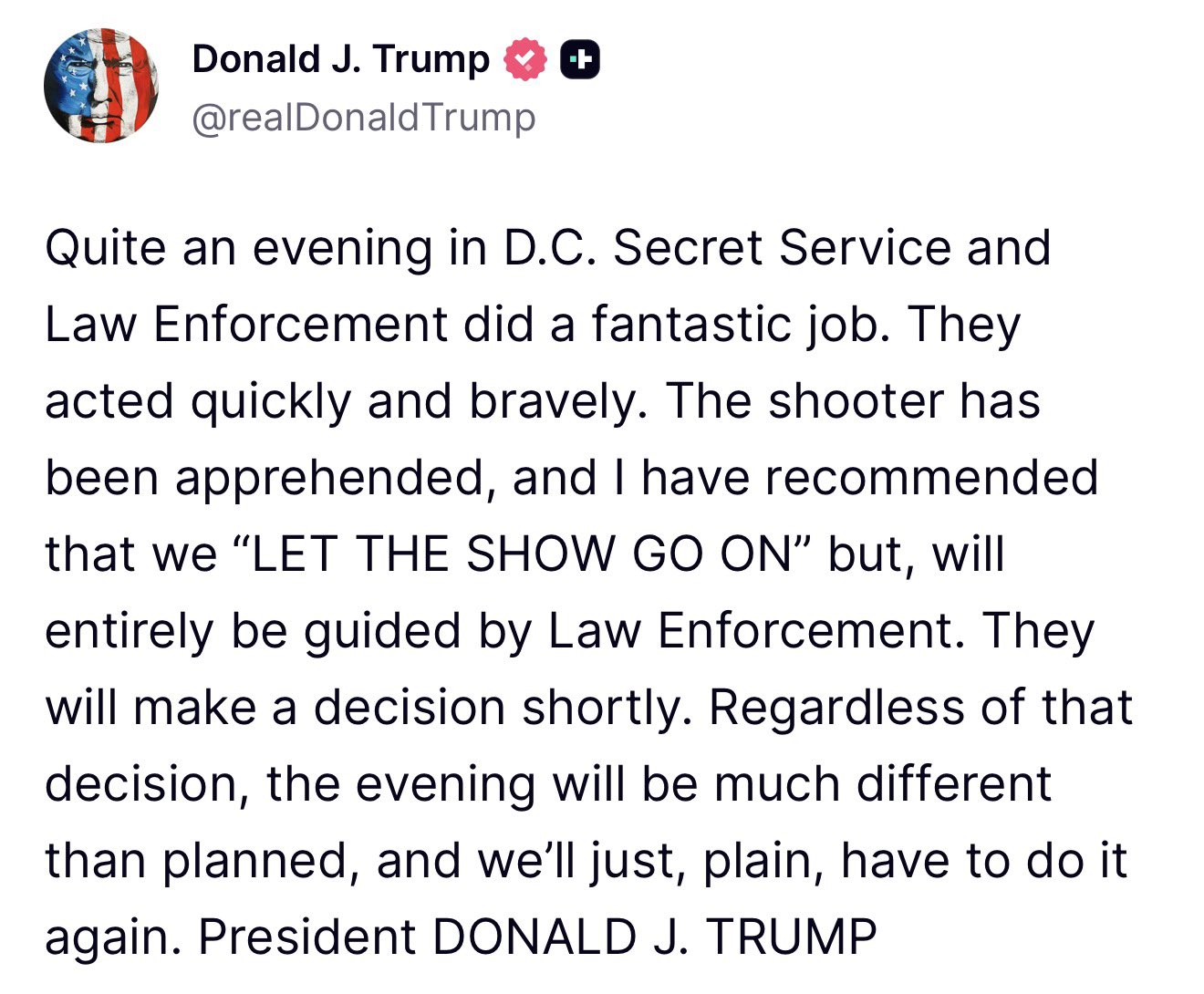 अभी तक ये साफ नहीं हो पाया है कि हमलावर एक ही था या घटना में कुछ और लोग भी शामिल थे. घटना के बाद पूरे हिल्टन होटल को खाली करा दिया गया. सीक्रेट सर्विस की तरफ बयान जारी कर कहा गया है कि राष्ट्रपति सुरक्षित हैं और जांच जारी है.