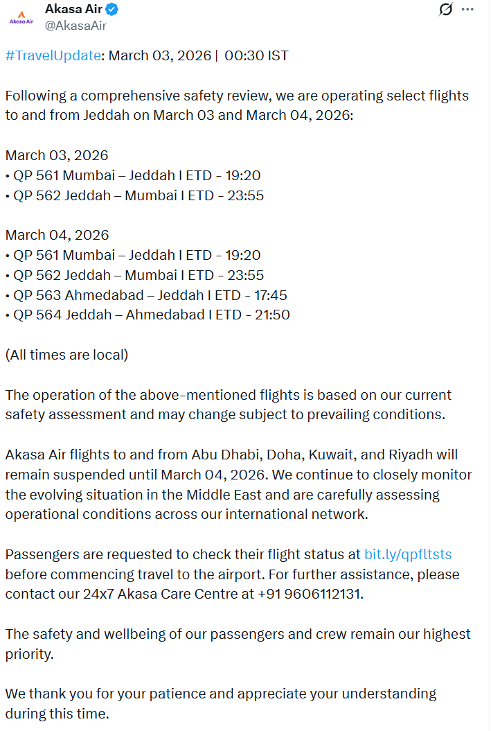 अकासा एयर ने कहा कि कंपनी 3 और 4 मार्च को जेद्दा के लिए और वहां से कुछ चुनिंदा फ्लाइट्स चला रही है.