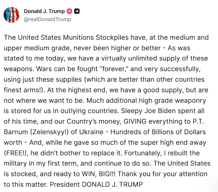 US प्रेसिडेंट डोनाल्ड ट्रंप ने मंगलवार को कहा कि यूनाइटेड स्टेट्स के पास ऐसे हथियारों की “लगभग अनलिमिटेड सप्लाई” है, जो लंबे वक्त तक चलने वाले युद्धों को झेलने में सक्षम हैं. यह मानते हुए कि हाई-एंड हथियारों का रिज़र्व अभी ज़रूरी लेवल पर नहीं है, ट्रंप ने कहा कि साथी देशों के पास और भी एडवांस्ड हथियार स्टोर हैं.