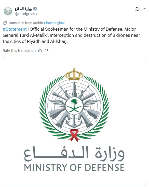 सऊदी अरब के रक्षा मंत्रालय ने कहा कि उसने रियाद और अल-खर्ज शहरों के पास आठ ड्रोन रोके और नष्ट कर दिए.