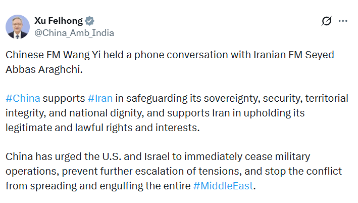 भारत में चीनी एम्बेसडर, शू फेइहोंग ने कहा कि चीनी विदेश मंत्री वांग यी ने ईरानी विदेश मंत्री सैयद अब्बास अराघची से फ़ोन पर बात की.