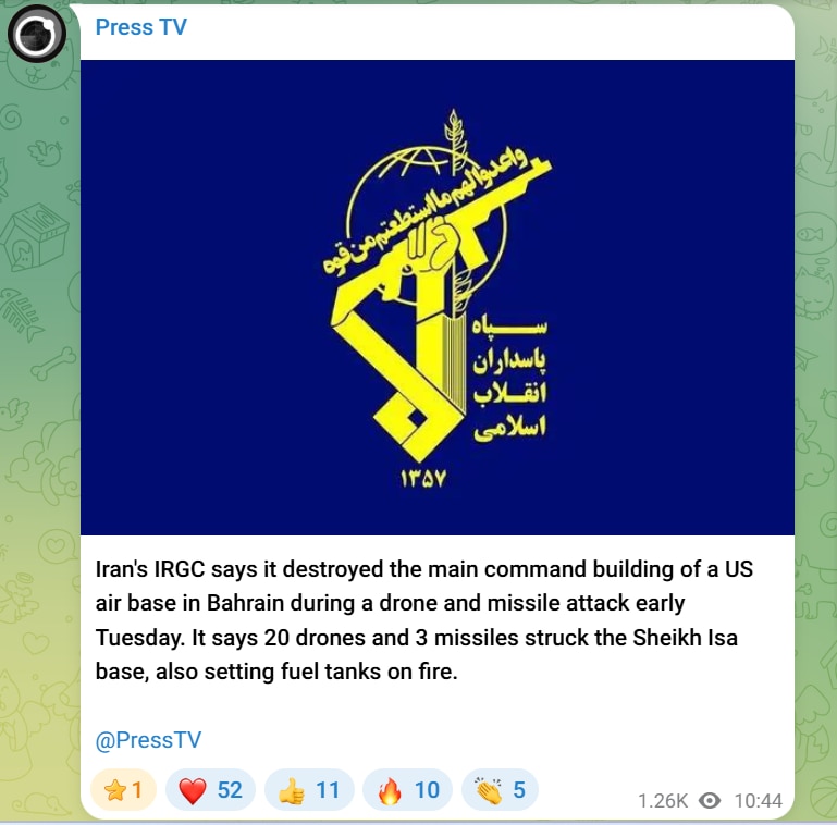 इस्लामिक रिवोल्यूशनरी गार्ड कॉर्प्स (IRGC) ने दावा किया है कि आज सुबह, हमने बहरीन के शेख ईसा में US बेस पर प्रेसिडेंशियल कमांड बिल्डिंग को मिसाइलों और ड्रोन से निशाना बनाया.